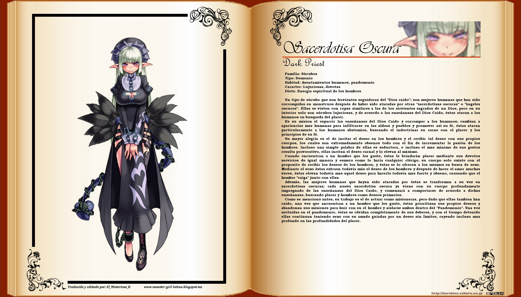 Entonces, volviendo a las chicas monstruo, esta vez tenemos a la sacerdotiza oscura, otra ficha relacionada con el Dios Caido, ahora pensando un poco habia llegado inicialmente a la teoria que este Dios Caido podria ser el anterior Rey demonio que habria "Caido" de su trono y eso, pero el hecho que en sus enseñansas esté esto del sexo entre montruos y hombres me hace dudar, ya que los tiempos del anterior rey Demonio eran como en cualquier otro mundo de fantasia RPG, monstruos monstruosos y otras razas peleandose entre sí y eso, ahora, también existe la posibilidad de que los poderes de la nueva Rey Demonio hayan hecho efecto en el anterior (si es que no lo mató para llegar al puesto) y de ahi su nueva vision del mundo, o que simplemente esté usando esto del sexo para acumular poder (energia demoniaca) y volver a ir por el trono, no se, habria que ver que dice el lore oficial y eso :V
