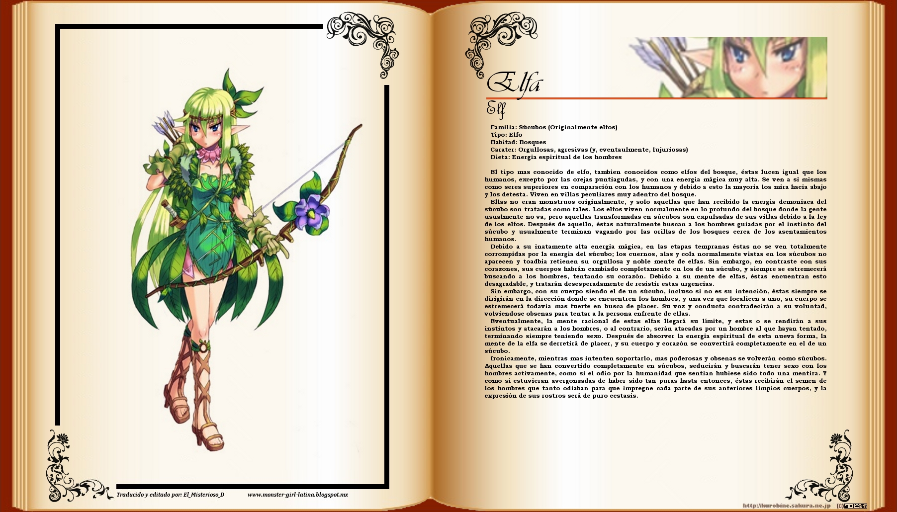 Y bueno, que como dato curioso en el mundo de las CM existen dos tipos de elfos, los "puros" que siguen igual que como hace miles de años y las "contaminadas" que han sido infectadas por la energia demoniaca de los súcubos, por lo que podriamos ponerlos como elfos-elfos y elfos-monstruos por separado, pero bueno que la ficha nos explique un poco mejor :T