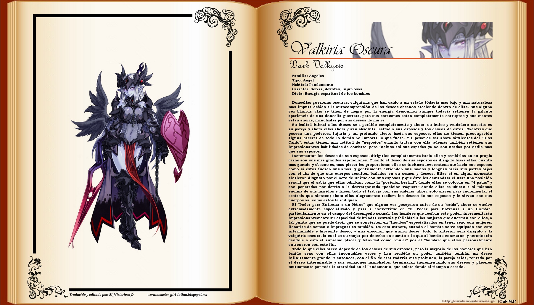 Y esta es la segnda parte de la historia, ya que si han leido la ficha anterior, igual que con los ángeles las valquirias pasan por esta transformación hacia su version oscura o totalmente pervertida, en fin que como es el mismo tema esta vez no habrá datos de trivia, también notarán que he decidido agregar la tag para la colección del El Dios Maestro, principal antagonista del Rey Demonio y deidad a la que adora La Orden y demás que se oponen a las chicas monstruos y eso, asi que con tanta importancia no podria ser de otra forma que el tener su propia etiqueta :T
