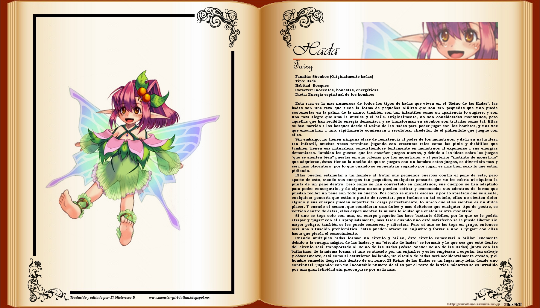"Un hada (del latín fatum: hado, destino) es una criatura fantástica y sutil. En la mitología griega y romana las llaman Hadas. Se las representa generalmente en forma de mujer hermosa y bella con alas de mariposa. Según la tradición son protectoras de la naturaleza, producto de la imaginación, la tradición o las creencias y pertenecientes a ese fabuloso mundo de los elfos, gnomos, duendes, sirenas y gigantes que da color a las leyendas y mitologías de todos los pueblos antiguos. Se puede provocar el contacto con ellas desarrollando la visión etérea según las leyendas. La mayoría de ellas se representan con alas.