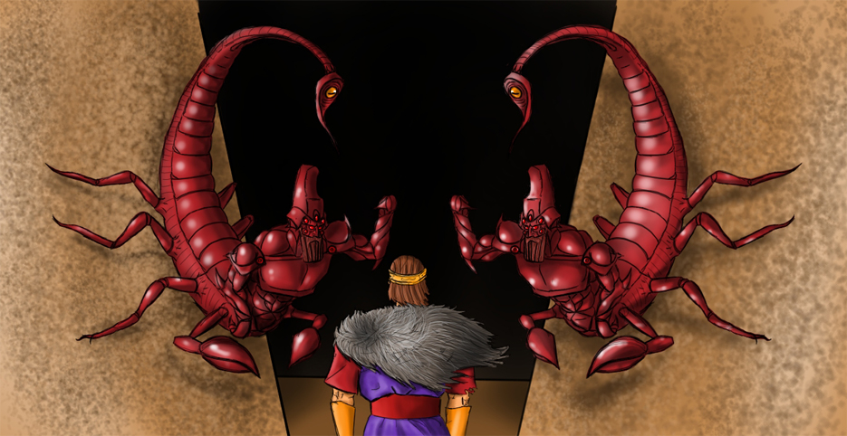 "Los Hombres Escorpión están presentes en muchos mitos acadios, incluyendo el Enûma Elish y la versión babilónica de la epopeya de Gilgamesh. Eran también conocidos como aqrabuamelu o girtablilu . Primero fueron creados por Tiamat a fin de librar la guerra contra los dioses menores por la traición de su compañero Apsu. En el poema de Gilgamesh, están de guardia fuera de las puertas del Dios Sol (Shamash), en las montañas de Mashu. Estas dan entrada a Kurnugi, la tierra de la oscuridad.
