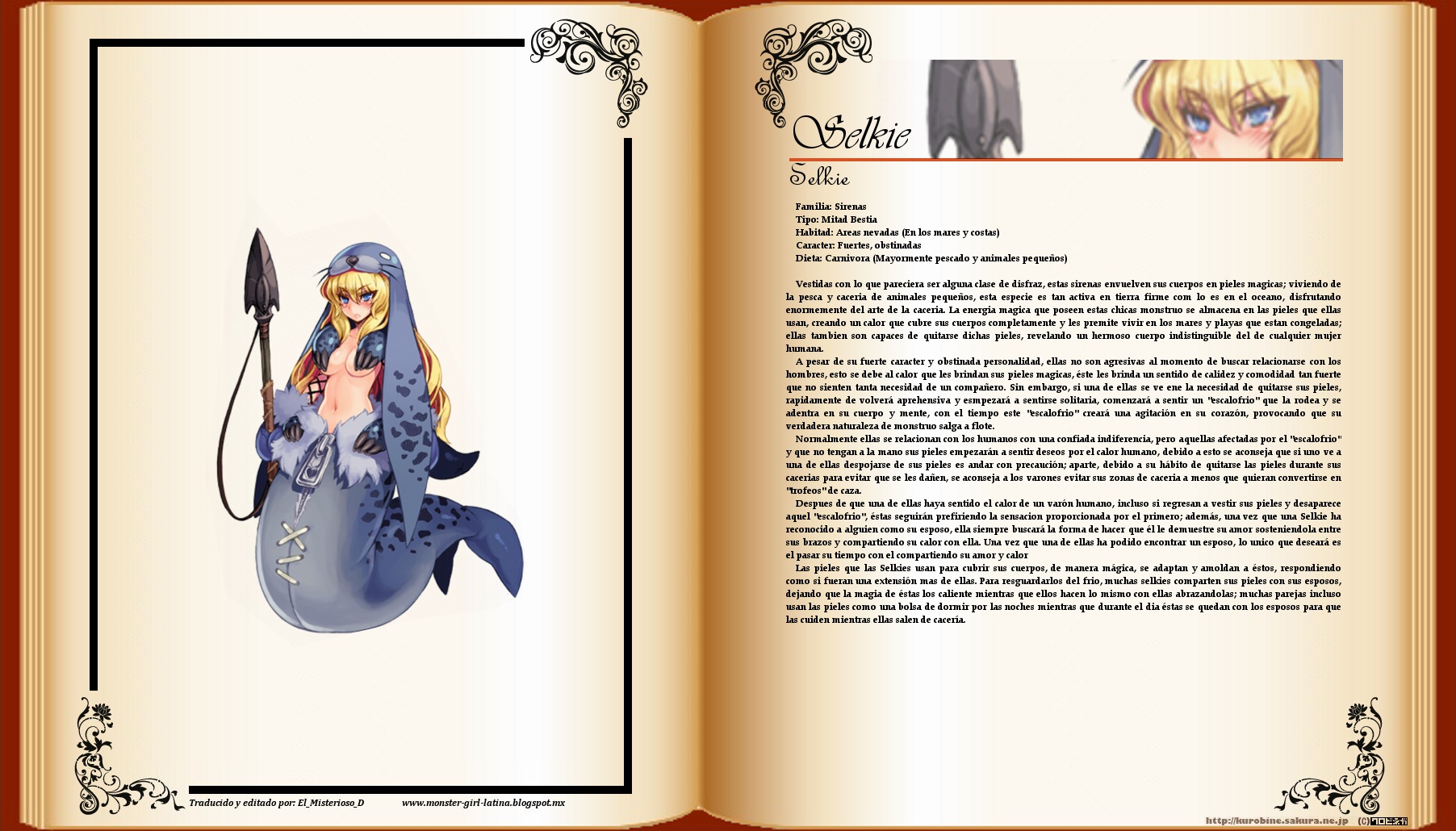 "Selkie (también llamado silkie o selchie) es una criatura mitológica proveniente del folclore feroés, islandés, irlandés y escocés. Las selkies eran grandes focas.