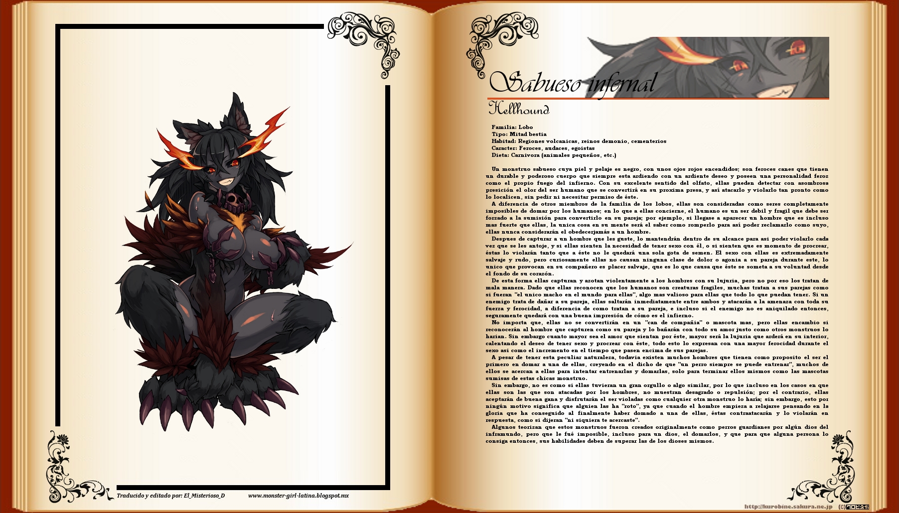 "Un hellhound o sabueso infernal es un perro o sabueso del Infierno. Según la mitología, y la ficción, los perros son muertos vivientes con una apariencia que puede recordar a unos perros de gran tamaño. Normalmente acompañan a los guardabosques esqueletos o a los jinetes muertos. En apariencia, suelen verse de color negro o blanco algo esquelético, ojos rojos o amarillos, además de poseer una enorme fuerza y velocidad, suelen oler a muerto y en ocasiones tienen la habilidad de hablar. Algunas creencias dicen que si una persona los puede ver físicamente se morirá al instante, significa que se le aproxima la muerte, ya que son invisibles como los fantasmas. Los perros del infierno están asociados con el fuego, y tienen habilidades al respecto, porque usualmente están encargados de resguardar la entrada al inframundo, a los muertos, a las almas perdidas y tesoros sobrenaturales. Existe una leyenda de que si alguien los mira a los ojos tres veces, la persona morirá instantáneamente."