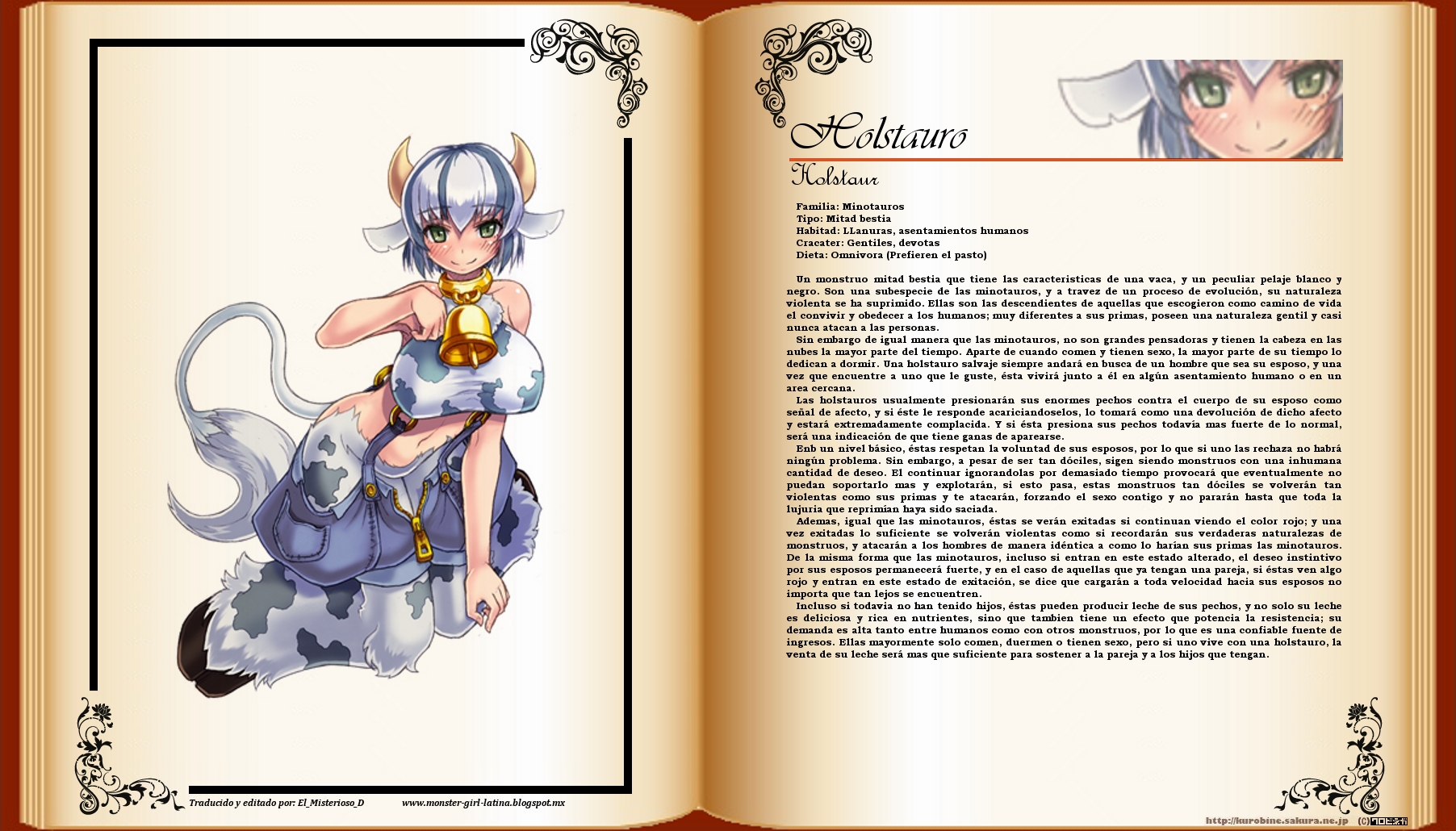 Y bueno shavos, hoy toca una ficha de mis favoritas, las vaquitas holstauro, curiosamente no encontré nada sobre las mismas, almenos nada cultural o de folclore, y pareciera que las inventaron solamente para la enciclopedia (y para algo llamado Dark Horizon, aunque igual tomaron prestada la idea :V), en fin, que son monstruos que me gustan mucho, son muy lindas la verdad XD.